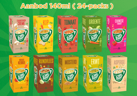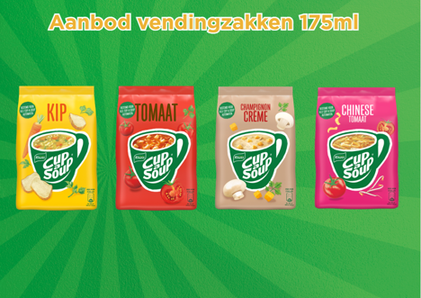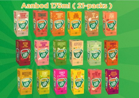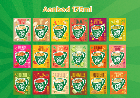 Cup-a-Soup is verkrijgbaar in portieverpakkingen van 140ml, 175ml en automatensoep.